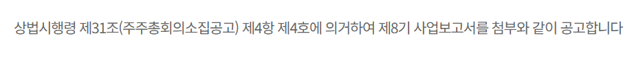 넥써쓰IR공고(주)액션스퀘어 제8기 사업보고서(2022.03.17)등록일 : 2022년 3월 17일첨부파일 : (주)액션스퀘어 제8기 사업보고서_2022.03.17 ※ 회사 웹페이지 개편으로 해당 페이지로 이관되었습니다.Updated 2 days ago (주)액션스퀘어 제8기 결산공고(2022.03.25)(주)액션스퀘어 제8기 연결감사보고서(2022.03.17)Ask AI